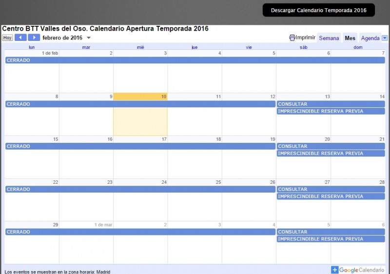 Calendario apertura 2016. Alquiler de bicicletas en la Senda del OSo
