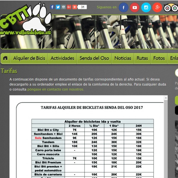 Senda del oso. Tarifas alquiler de bicicletas 2017